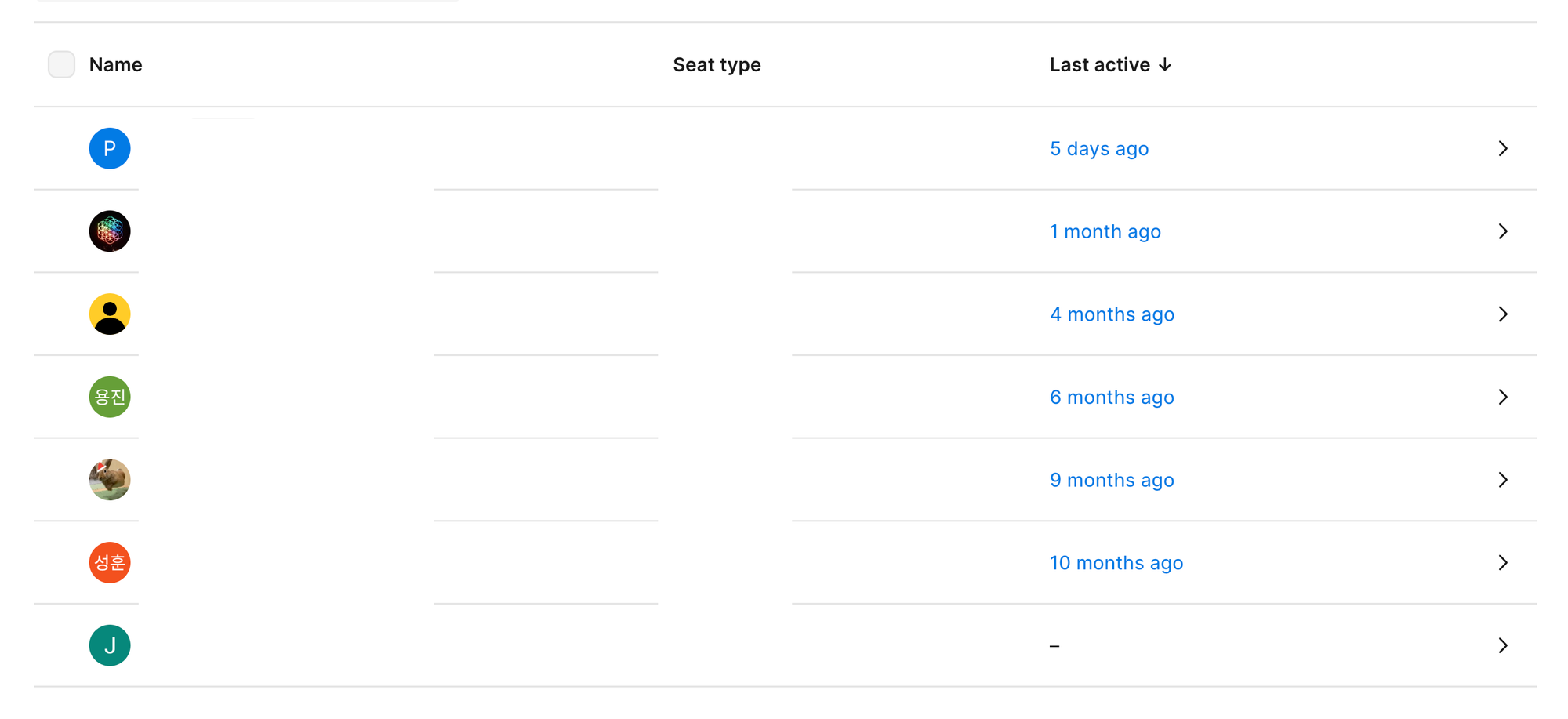 관리자 페이지에서 조직원들의 최근 로그인 날짜 (Last Active)를 확인할 수 있습니다.