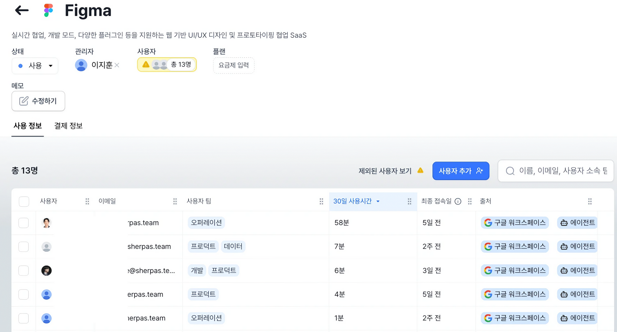 심플리(SMPLY)의 PC에이전트를 사용하면 각 조직원의 피그마 사용 시간과 최근 접속일을 파악할 수 있습니다. 단순히 최근 접속일로만 판단하는 것이 아닌, 실질적으로 사용 시간을 파악해서 비용을 최적화 할 수 있습니다.