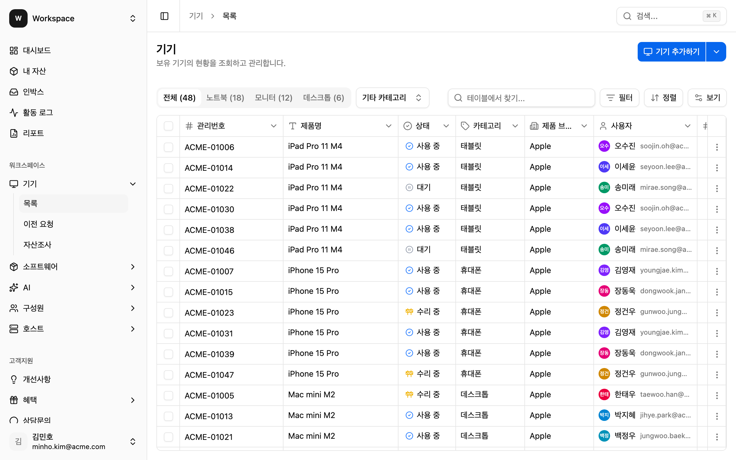 - 사용 중: 현재 담당자에게 배정된 기기