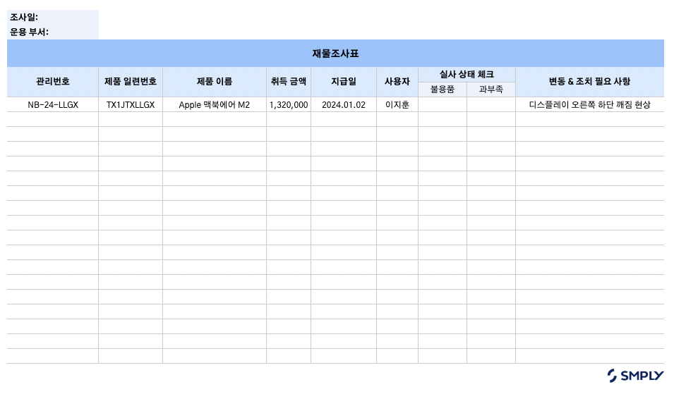 담당자는 큰 그림을 그릴 수 있어야 합니다. 조사의 목적, 기간, 범위, 참여 인원 등을 정의하는 사전 작업이 필요한데요. 여기서 재물조사표 혹은 자산조사표가 필요합니다. 표에 관리 번호, 자산 이름, 금액 등을 기입하는데요. 다양한 양식의 표가 있지만, 처음 조사를 기획할 때 기준점을 명확히 잡은 뒤 현재 조직에 필요한 내용을 기입합니다.