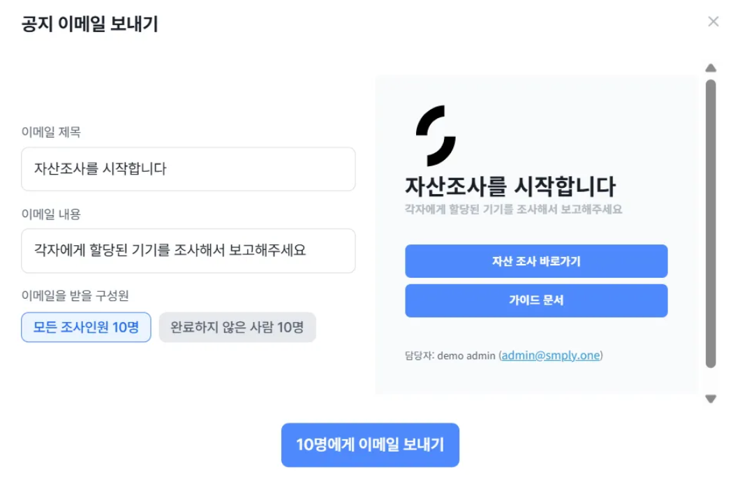 자산조사 메일을 보내면, 조사 참여자는 메일을 통해 심플리로 접속할 수 있습니다. 이후, 자신에게 할당된 기기 조사를 시작하면 되는데요. 여기서 참여자는 담당자가 할당한 기기의 정보를 입력할 수 있습니다.
