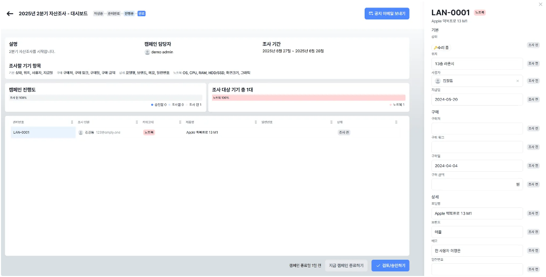 할당된 조사가 끝나고, 해당 정보는 담당자의 승인이 있어야 최종적으로 적용됩니다. 즉, 담당자는 참여자의 조사 상태를 확인 후에 그대로 승인하거나 직접 수정할 수 있는데요. 이를 통해 보다 꼼꼼하게 캠페인을 마무리할 수 있습니다.
