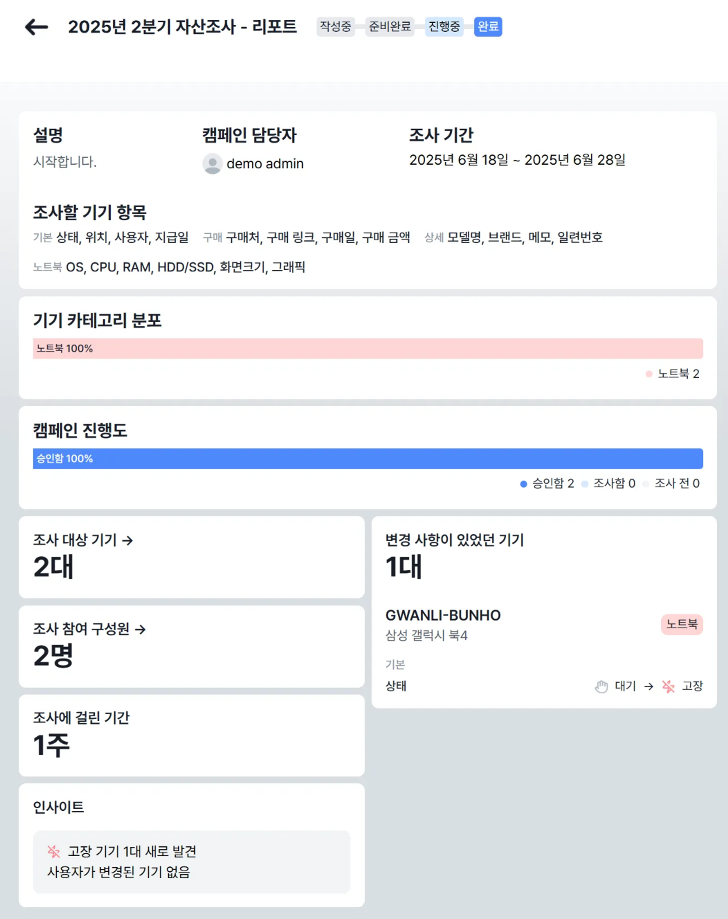 캠페인을 종료하게 되면 아래와 같이 캠페인의 전체적인 데이터를 확인할 수 있습니다. 담당자는 조사 대상 기기가 몇 개였는지, 구성원은 몇 명이며 해당 캠페인을 통해 변동된 사항 등을 확인하게 됩니다.